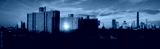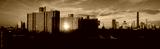 New York City High Rise Residential Red Brick Buildings in Brooklyn with Manhattan Skyline in the distant backgrounds at dramatic cloudy sunrise after winter snow storm, USA