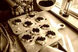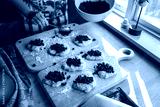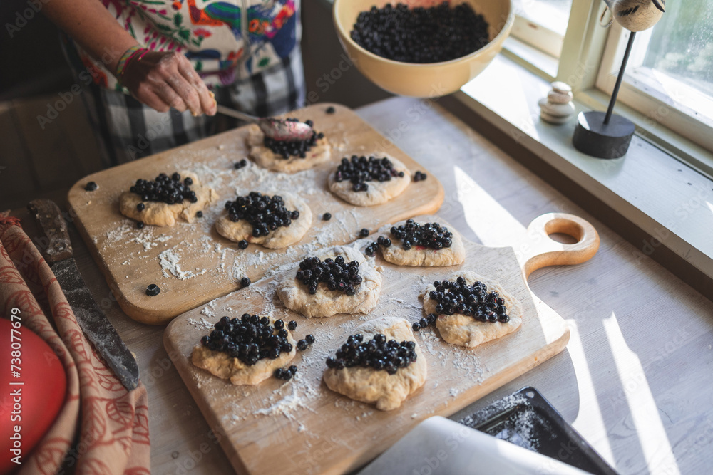 Woman preparing blueberry buns at home (Jagodzianka - traditional Polish sweet bun filled with blueberries)