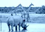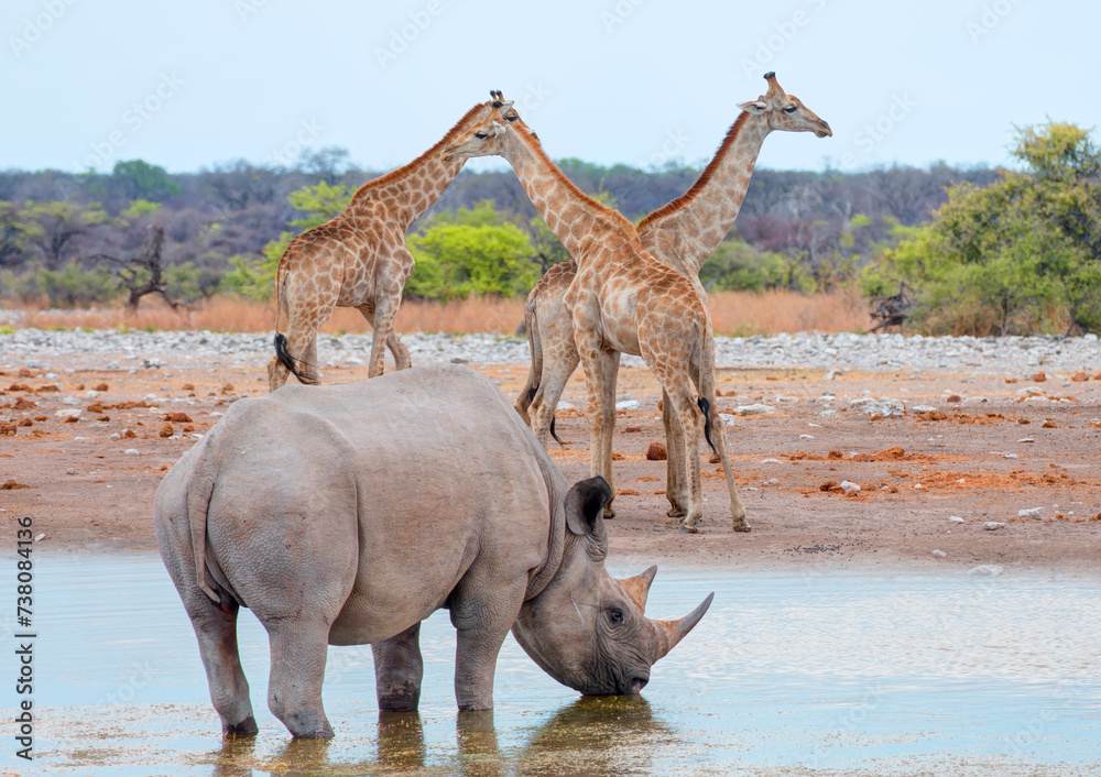 A rhino is drinking water in a small lake - Giraffe family walking in the Etosha park - Etosha National Park, Namibia, Africa