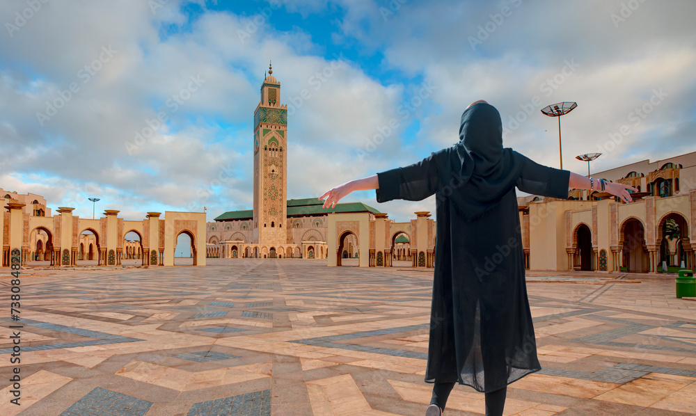 Beautiful girl wearing abaya with arms up happy - Landscape of Great Hassan II mosque - Casablanca, Morocco