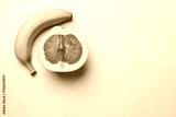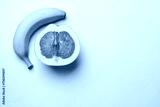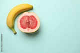 Banana and half of grapefruit on turquoise background, flat lay with space for text. Sex concept