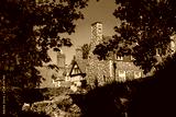 Lush treetops and ruins of stone walls frame the view of old village houses