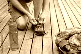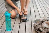 Person tying shoes getting ready for hike outdoor adventure. Active lifestyle activity concept