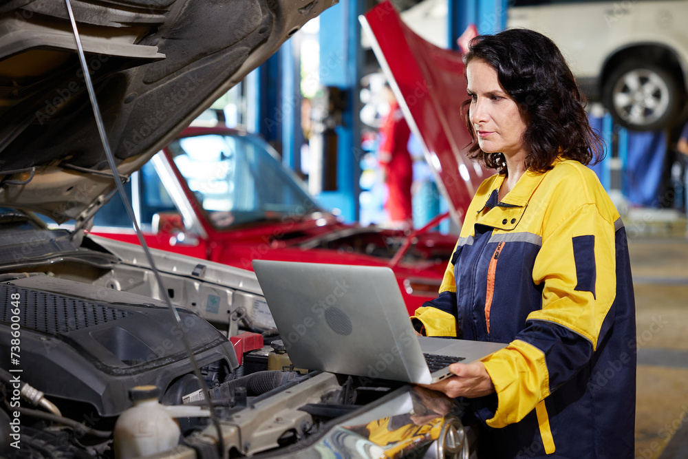 mechanic using laptop computer for checking and fixing a car in automobile repair shop