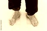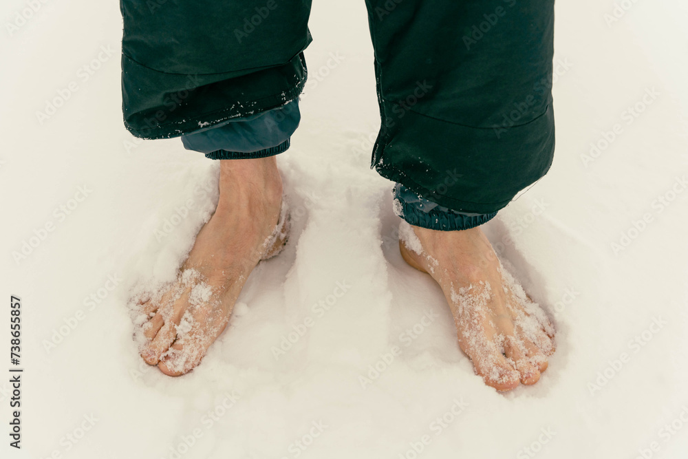 Men's bare feet are standing on the snow