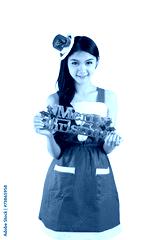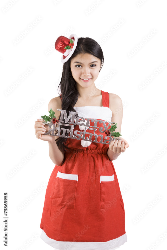 Beautiful young Santa woman with Merry Christmas decoration on w