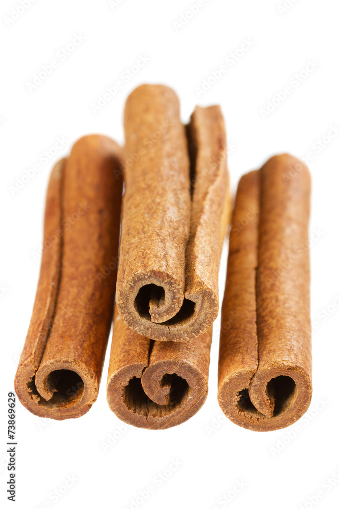 heap of cinnamon sticks isolated on white