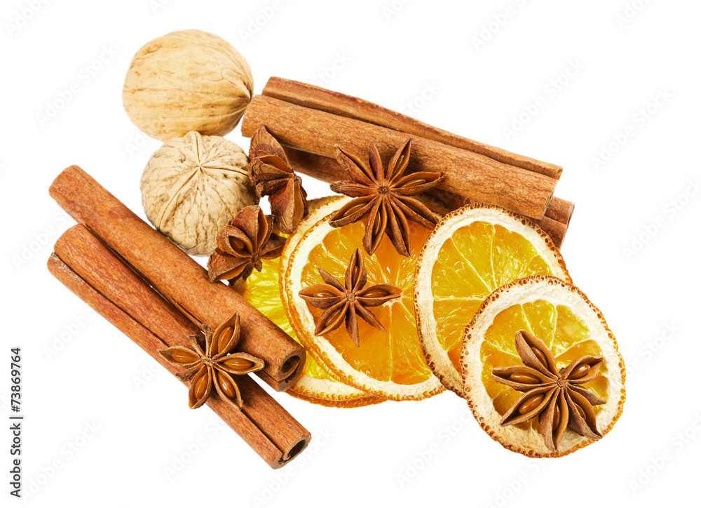 anise star, cinnamon sticks, walnut and dried orange isolated