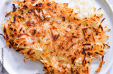 Potato pancakes on plate. Latkes, flapjacks potato for restaurant, menu, advert or package, close up, selective focus