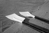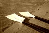 blades of hatchet sculling oars against grunge, rustic wooden deck