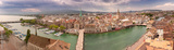 Aerial panorama of Zurich Old town with famous Fraumunster, St Peter churches and river Limmat from Grossmunster Church, Switzerland