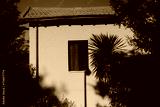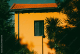 Orange building with green shutters on window in sunny day. Rural house among palm trees. Villa, cottage, chalet for summer vacation. Summertime house