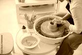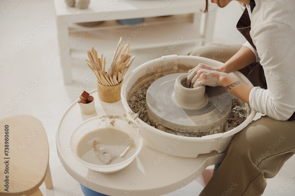 Close up of artisan's hands shaping clay bowl in pottery studio. Pottery art and creativity