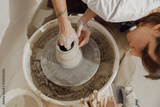 Close up of hands of professional potter molding pot shape on pottery wheel. Ceramics art concept