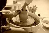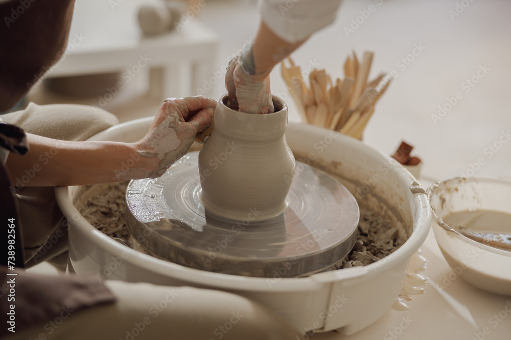 Close up of hands of professional potter molding pot shape on pottery wheel. Ceramics art concept