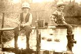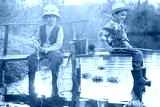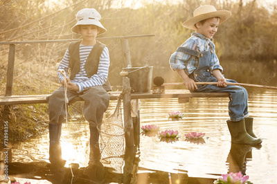 Boy fishes on a bridge on the lake