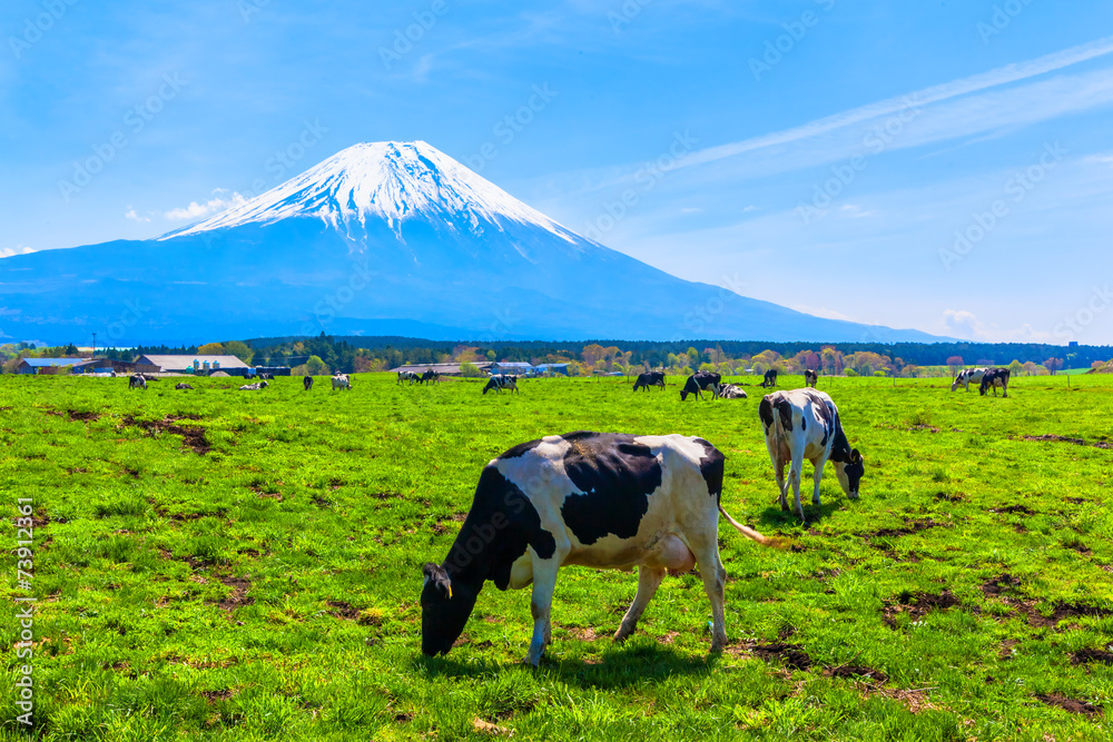 Cattle grazing in Asagirikogen to Mount Fuji views