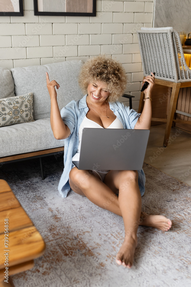 Curly young woman enjoying time at home, working on her laptop with headphones, in a casual setting.