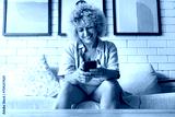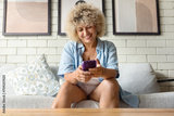 A joyful curly-haired young woman comfortably using her smartphone, evoking a sense of everyday happiness and relaxation.