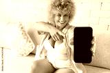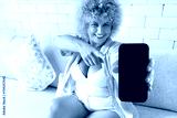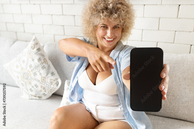 Cheerful curly-haired woman sitting on the couch, holding and pointing to a blank smartphone screen with a beaming smile.