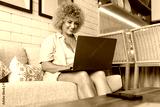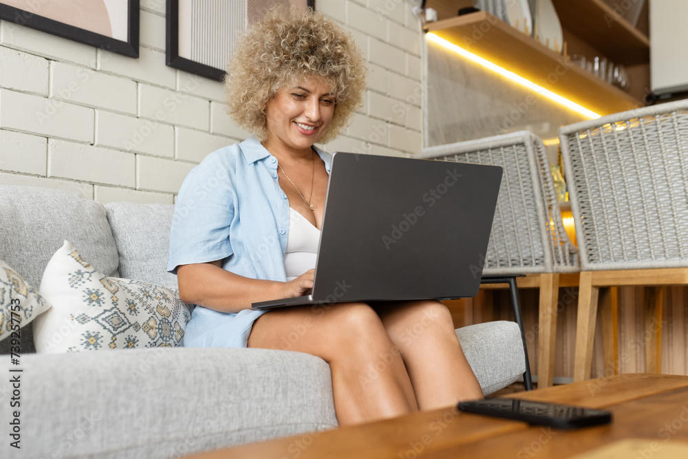 Cheerful curly-haired young woman using a laptop on a cozy sofa at home, embodying a relaxed work-from-home lifestyle.