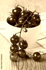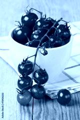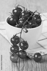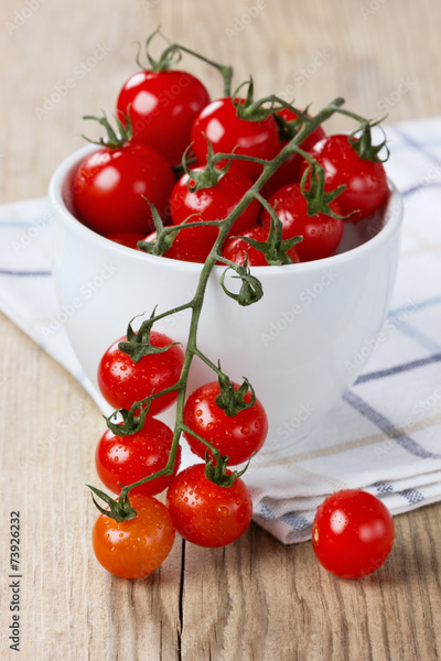 Cherry tomatoes on vine in a bowl on a wooden rustic table