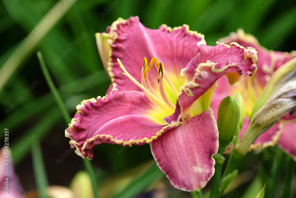 Pink and yellow frilled Hemerocallis hybrid daylily 'Raspberry Eclipse' in flower.