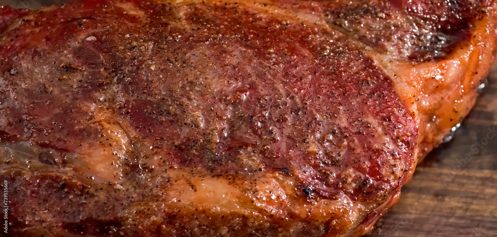 Beef Meat Baked on wooden board. Homemade cooking beef steak for restaurant, menu, advert or package, close up, selective focus