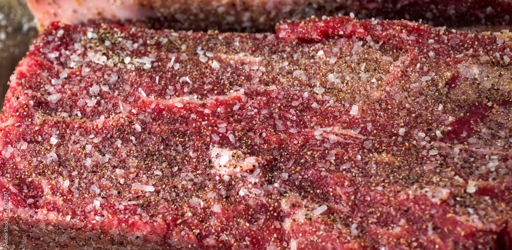 Beef Ribs Raw Meat stripes sliced on wooden board. Homemade cooking beef ribs for restaurant, menu, advert or package, close up, selective focus