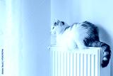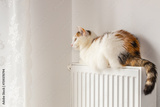 Beautiful tricolor cat sitting on the radiator and looking at the window, concept of domestic kitten or waiting for spring