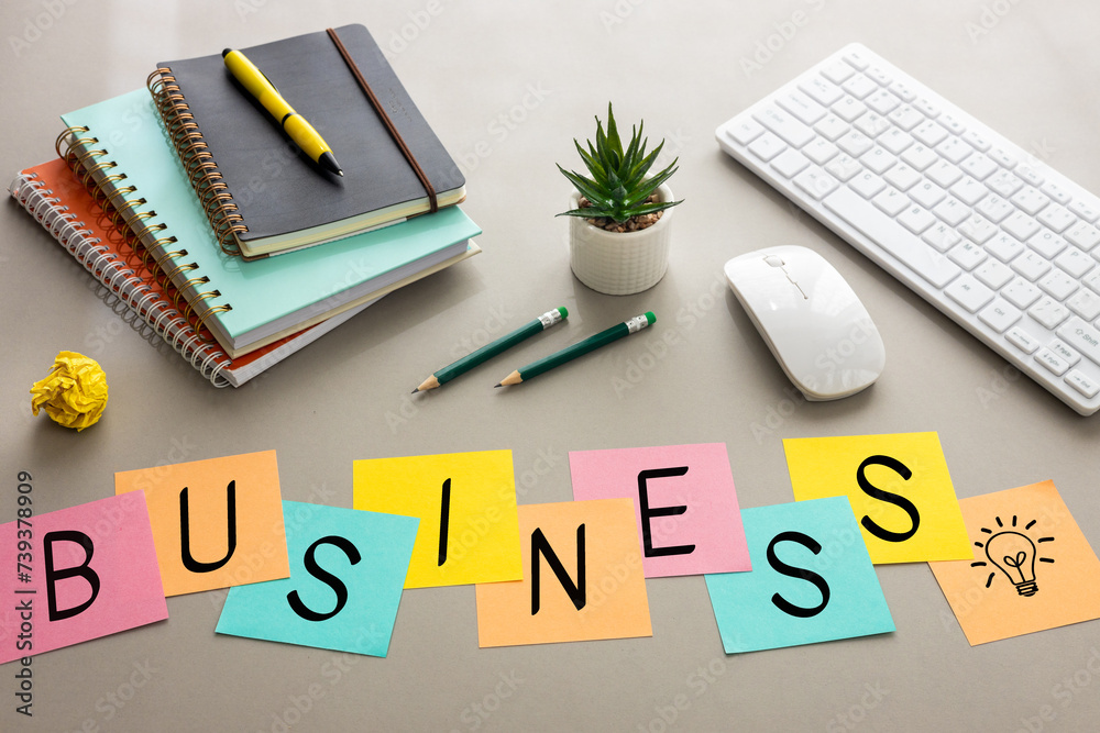 Business written on colorful sticky notes on a youth desk, Concept of planning to start a business from an early age, Business idea, Planning for the future, start up