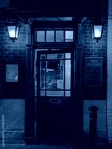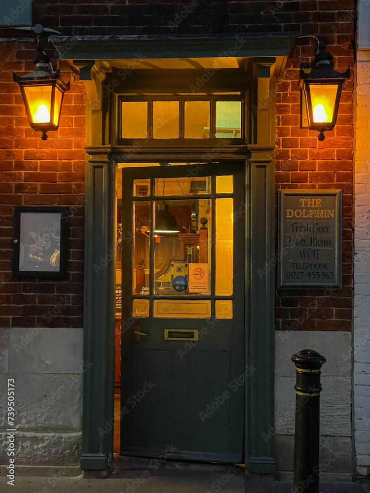 Twilight ambiance at a cosy English pub entrance illuminated by warm lanterns