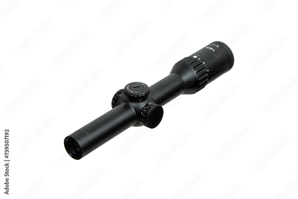 Modern sniper scope on a white back. Optical device for aiming and shooting at long distances.