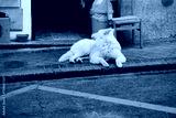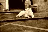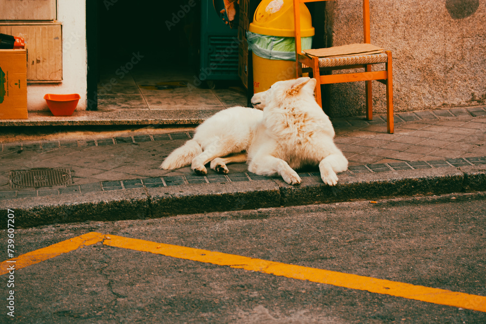 A white large dog lying on a doorstep of a house, looking back. Urban street cinematic photography. Dogs friendly place. Pet, domestic animal, canine.
