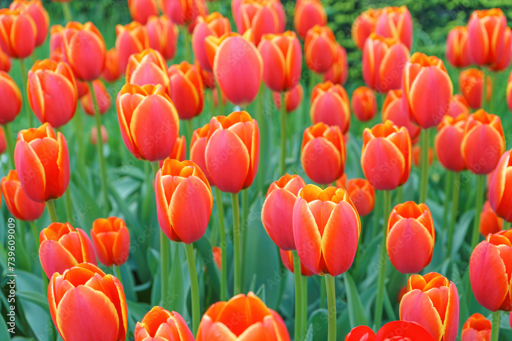 Orange with yellow edge tulips Verandi blooning in spring garden, park, flower background. Field of tulips with orange petals, bunch of flowers in flower bed.