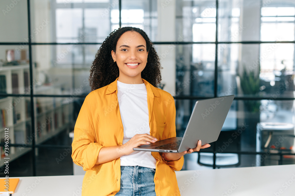Successful confident beautiful hispanic business woman in stylish clothes, business coach, manager, standing in a modern office, holding an open laptop, looking and smiling at camera