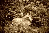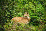 The axis female deer (or chital, axis axis) hides in the monsoon evergreen forest. Yala national park, Sri Lanka