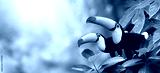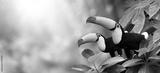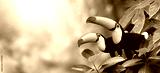 Horizontal banner with two beautiful colorful toucan birds (Ramphastidae) on a branch in a rainforest. Couple of toucan bird and leaves of tropical plants on sunny background