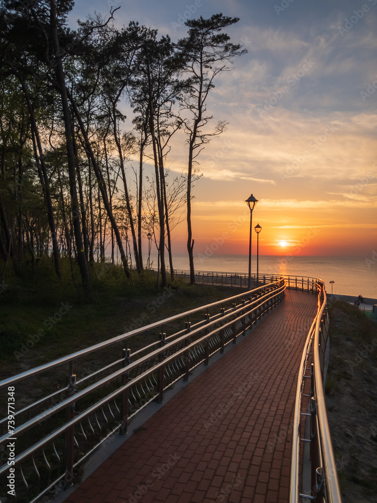 A tranquil pathway by the coast at sunset, featuring street lamps, trees, and a picturesque seascape.