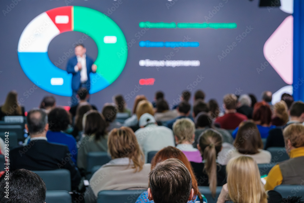 Focused audience at business seminar listening to a speaker presenting a financial graph on a large screen.