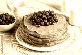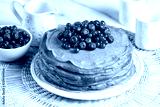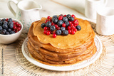 Stack of sweet homemade crepes, type of thin pancake, with blueberry and red currant. Breakfast on a white table.