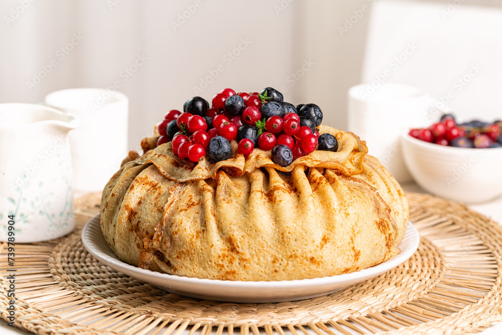 Homemade crepe cake, made of type of thin pancake and cream, decorated with blueberry and red currant.