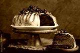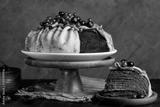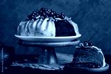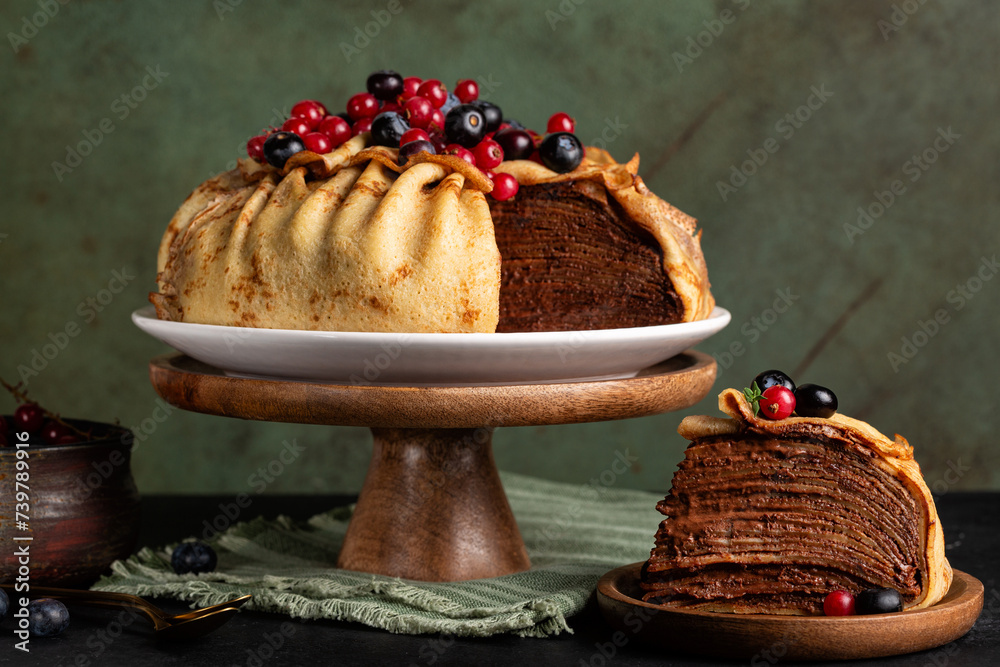 Homemade layered crepe cake, made of type of thin pancake and chocolate cream, decorated with blueberry and red currant, served on a dark table, green background.