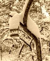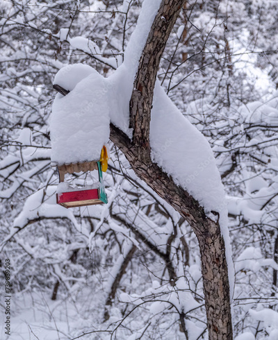 Bird feeder under the snow on a tree in the forest.