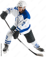 Man, hockey player with stick and puck, playing, training on rink against transparent background Concept of professional sport, competition, game, tournament, game, action, motion, championship, match