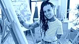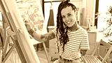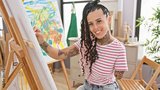 Confident amputee artist, joyful hispanic woman perfects drawing skill in the studio, embracing handicapped creativity with a smile