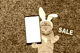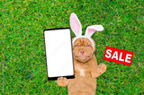 Happy Mastiff puppy wearing easter rabbits ears holds big smartphone with white blank screen in it paw and lies on its back on green grass. Top down view
