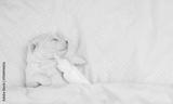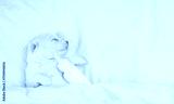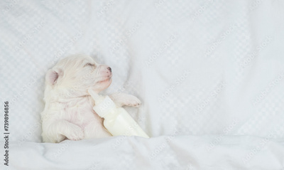 Tiny white Lapdog puppy sleeps on a bed at home and hugs bottle of milk. Top down view. Empty space for text