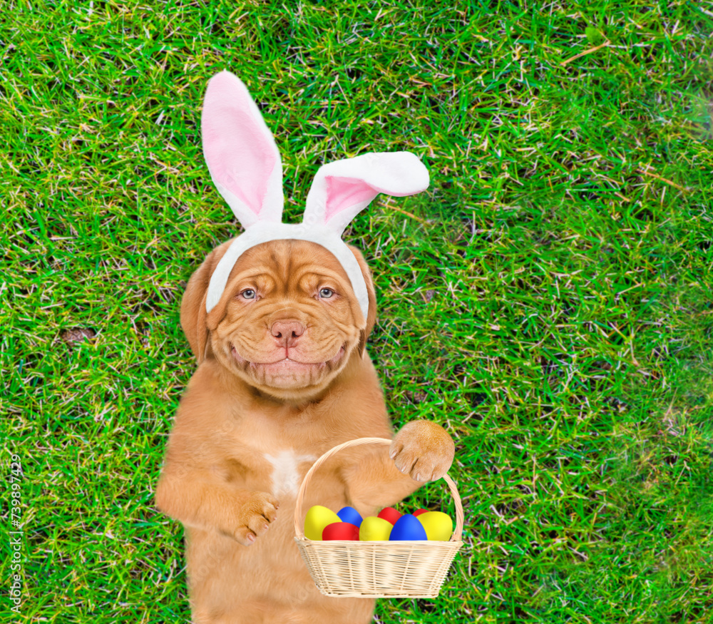 Smiling Mastiff puppy wearing easter rabbits ears holds basket of painted Easter eggs on green grass. Top down view