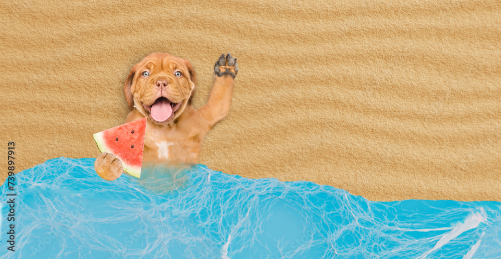 Happy Mastiff mastiff puppy lying at sunny beach and holding watermelon. Empty space for text
